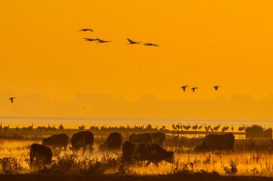 Die Sonne geht auf und die Kraniche fliegen zu ihren Fressflächen im Inland.