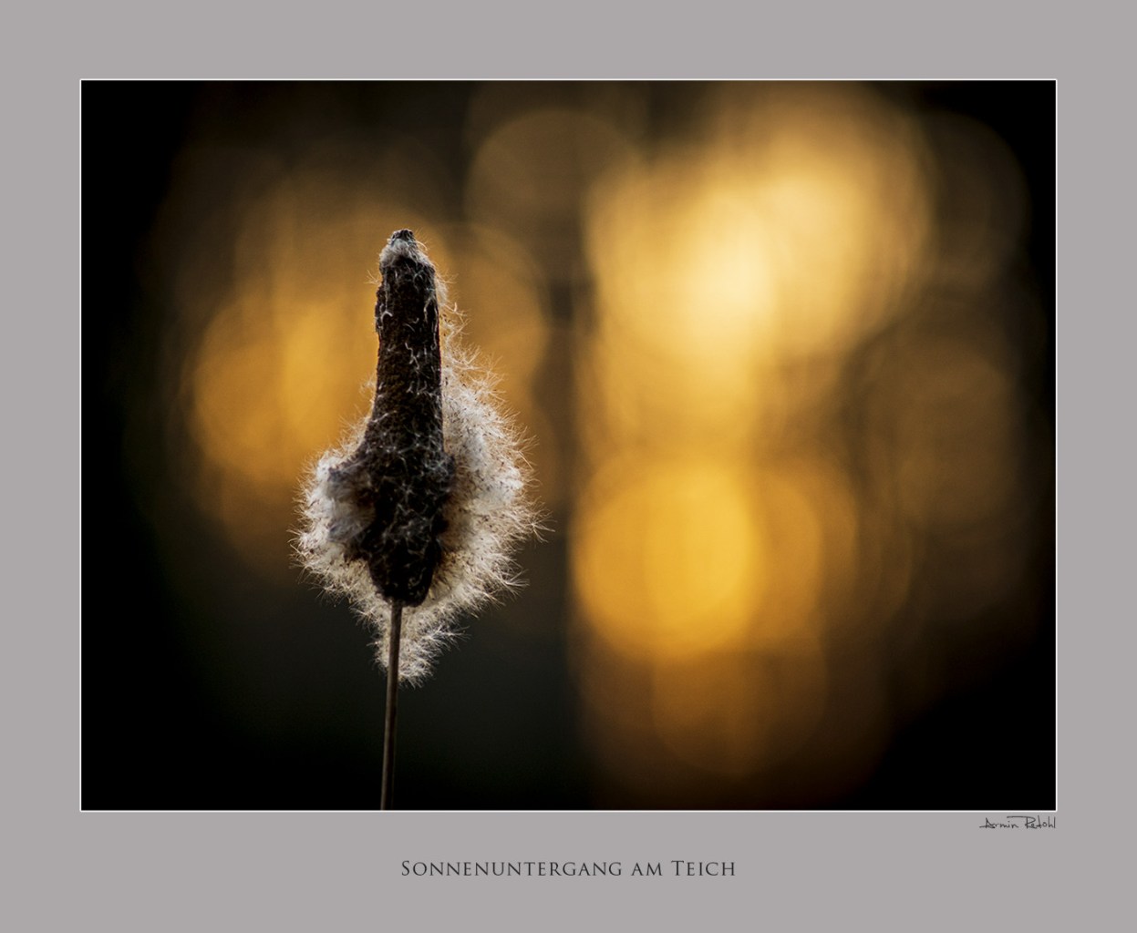 Die allerletzten Sonnenstrahlen des Tages spiegeln sich im Wasser eines kleinen Teichs im Wald. Durch die große Blendenöffnung des Teleobjektivs entstehen die wunderschönen runden Lichtkreise.