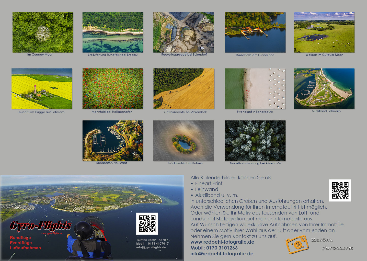 Ab sofort ist der neue Luftbildkalender mit Motiven aus Schleswig Holstein wieder erhältlich. Schwerpunkt der Fotos ist wie immer die Region Ostholstein. Für 25,-€ erhaltet Ihr einen Fotokalender im Format A3 quer, der auf hochwertigem 300g Fotodruckpapier hergestellt wurde. Jeder Kalender ist einzeln verpackt und in jedem befindet sich ein 10,-€ Gutschein der Fa. Gyro-Flights aus Pelzerhaken, mit der auch dieser Kalender wieder in Zusammenarbeit entstanden ist.
